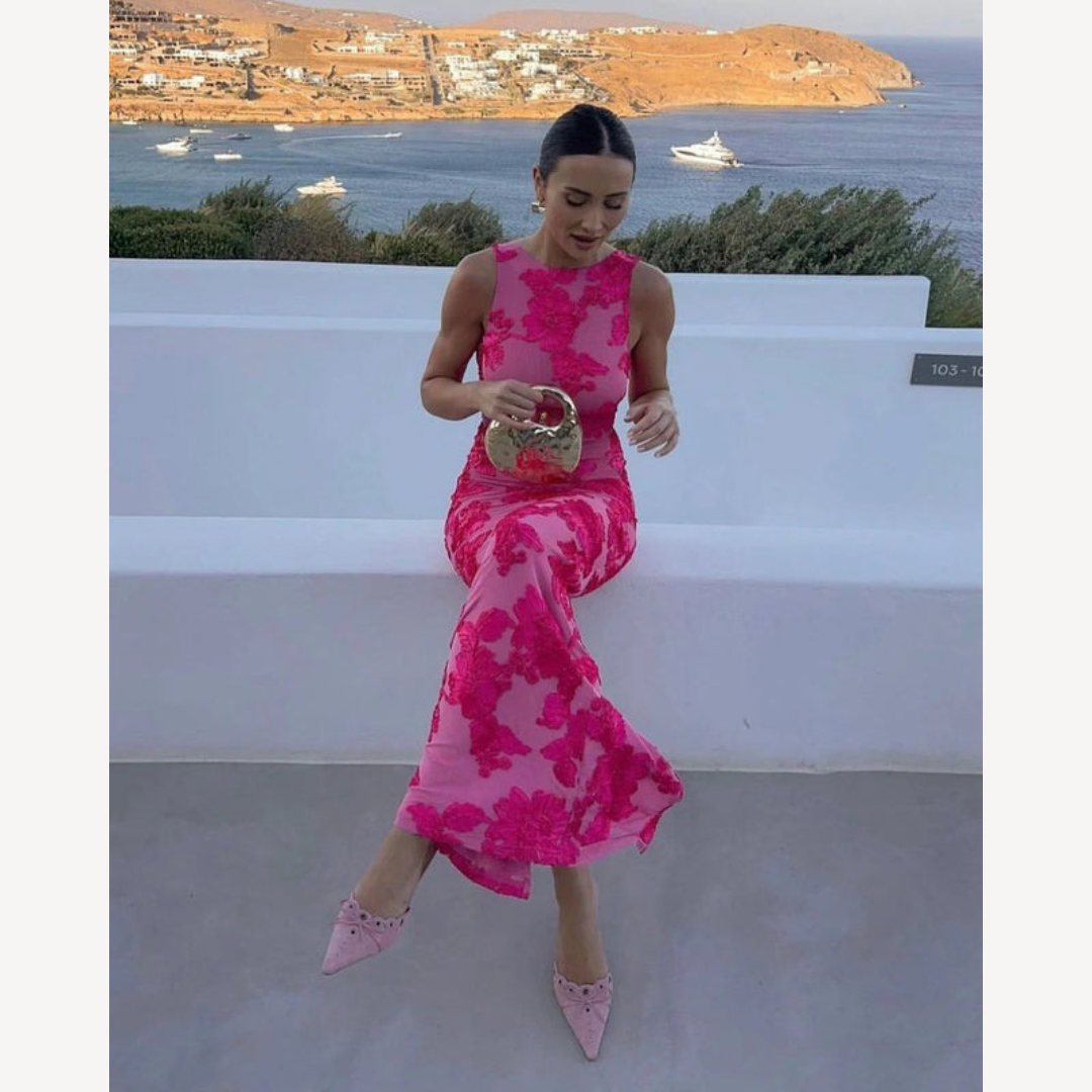 Dieses Abendkleid Blumen besticht durch ein leuchtendes pinkfarbenes Design mit einem kontrastierenden, dunkleren Blumenmuster, das sich über die gesamte Länge erstreckt. Das Modell ist ärmellos gestaltet und verfügt über einen hohen Racer-Ausschnitt, der die Schulterpartie betont. Die Passform ist körpernah gehalten und geht in einen bodenlangen Rockteil über, der eine klare Linienführung erzeugt.