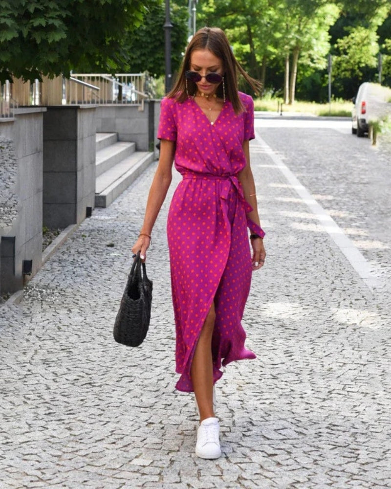 Dieses Damen-Wickel-Midikleid mit Blumenmuster verfügt über eine Bindeschleife in der Taille, die eine definierte Silhouette unterstützt und gleichzeitig eine fließende Passform ermöglicht. Der V-Ausschnitt ergänzt das Design mit einer ausgewogenen Linienführung, während der durchgehende florale Print dem Look eine frische Note verleiht. Ob für Renntage, Sommerhochzeiten oder lockere Zusammenkünfte – dieses Midikleid lässt sich vielseitig vom Tag bis in den Abend kombinieren.
