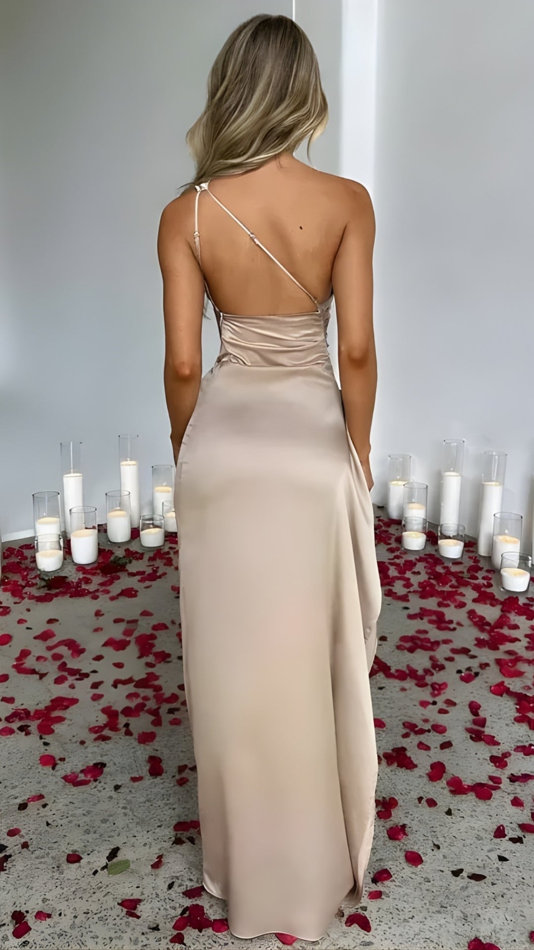 Dieses Abendkleid ist als Maxi-Kleid lang geschnitten und zeigt eine klare, fließende Silhouette. Der asymmetrische One-Shoulder-Ausschnitt sorgt für eine moderne Linienführung, während der Beinschlitz die Bewegungsfreiheit unterstützt. Das Modell eignet sich für formelle Abendveranstaltungen, Feiern oder besondere Anlässe.