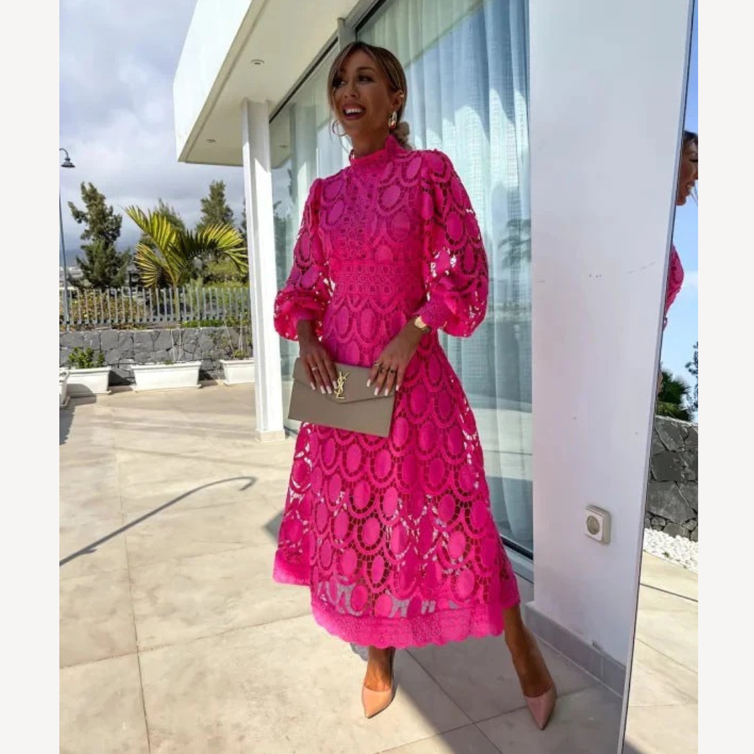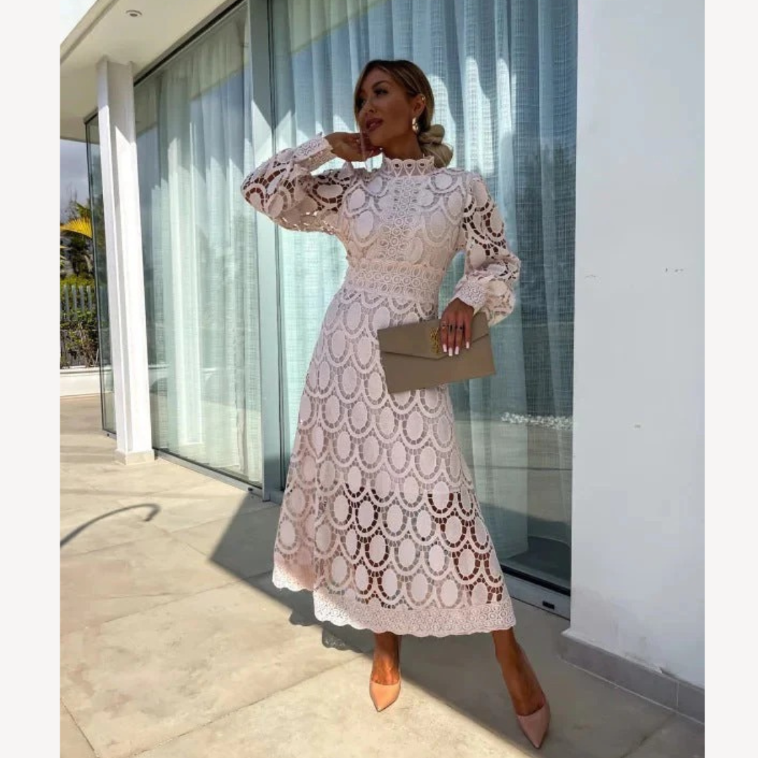 MIDI ABENDKLEID MIT GEHÄKELTER OPTIK – DIESE AUSFÜHRUNG VERFÜGT ÜBER EINEN HOCHGESCHLOSSENEN KRAGEN UND WEITE ÄRMEL.