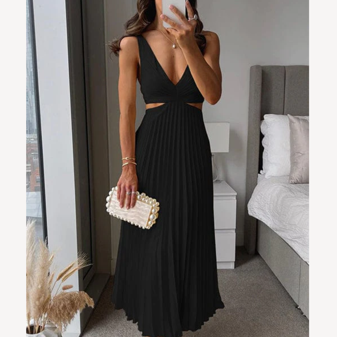 Plissiertes Abendkleid – Damen Elegantes Midikleid mit Langem V-Ausschnitt