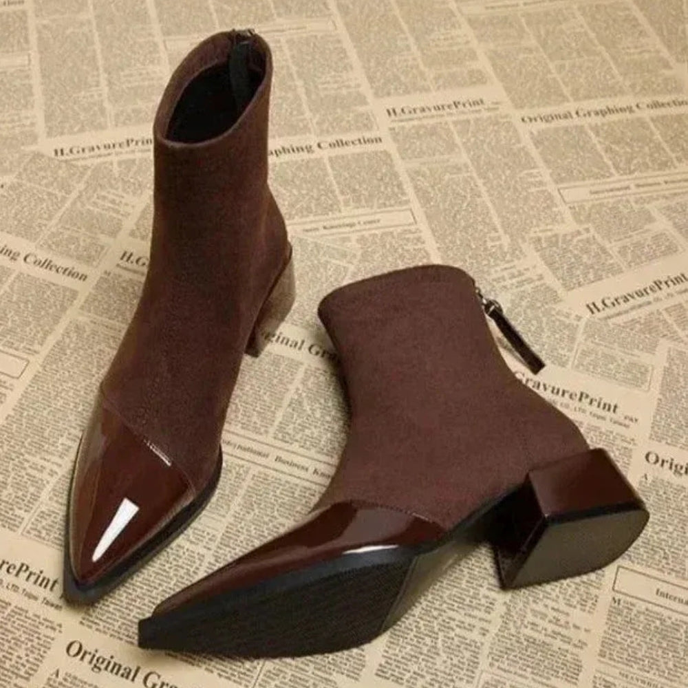 Diese Stiefeletten vereinen weiche Wildlederoptik mit glänzenden Lackdetails und schaffen so einen eleganten Kontrast. Die spitz zulaufende Form und der mittelhohe Blockabsatz sorgen für einen modernen, raffinierten Look, der Komfort und Stil harmonisch verbindet. Ideal, um Tages- und Abendoutfits mühelos zu vervollständigen.